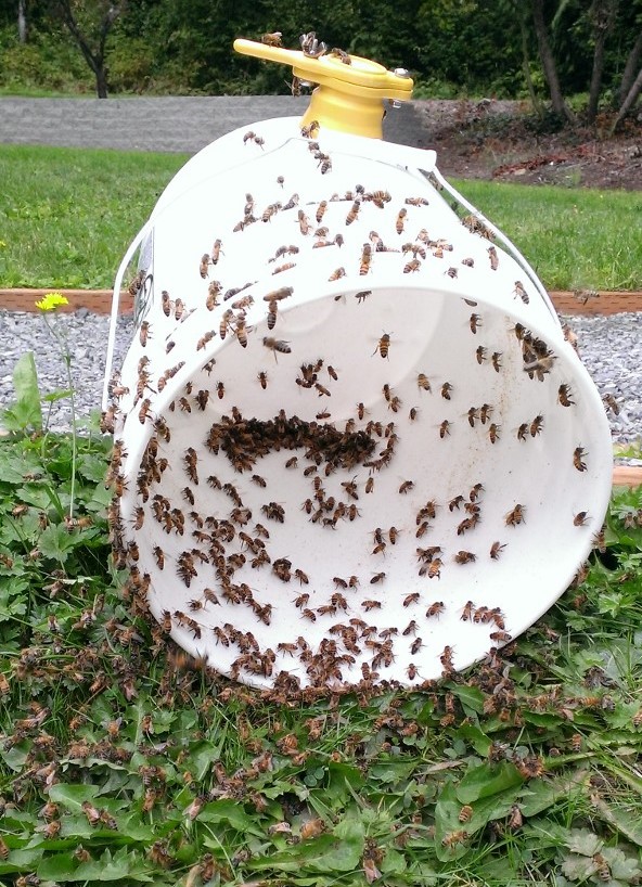 Bees saved and flourished: The bees did not disappoint. They came out in mass to reclaim every bit of the remaining honey from the bucket, from the ground, and from each other. After a close inspection of the area, not a single bee died from drowning in the honey. Success!