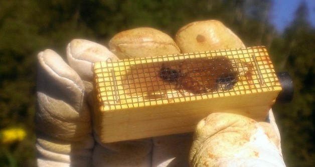 The purchased queen has already been mated, so she is ready to start laying once the hive accepts her. She comes in a small box with a sugar plug. You place her in the hive and she eats her way out of the box in about 4-5 days. This gives the hive time to get used to her before she emerges. We were told we had to destroy any queen cells in the hive before placing her in the hive or else the hive wouldn’t accept her. So we went about another inspection with a goal of removing all queen cells.