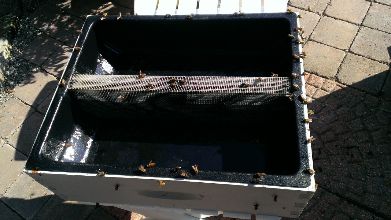 to get into the actual syrup outside the screen. Similar to what we saw earlier when we gave the bees a bucket with honey residue that had slowly puddled at the bottom, the bees get into the thick liquid, but they can’t get out and they will drown. When we came out to check on the set up to see if the bees were feeding, we found that many bees had made it to the syrup directly. We poured out the syrup to rescue the bees and set about this process again.