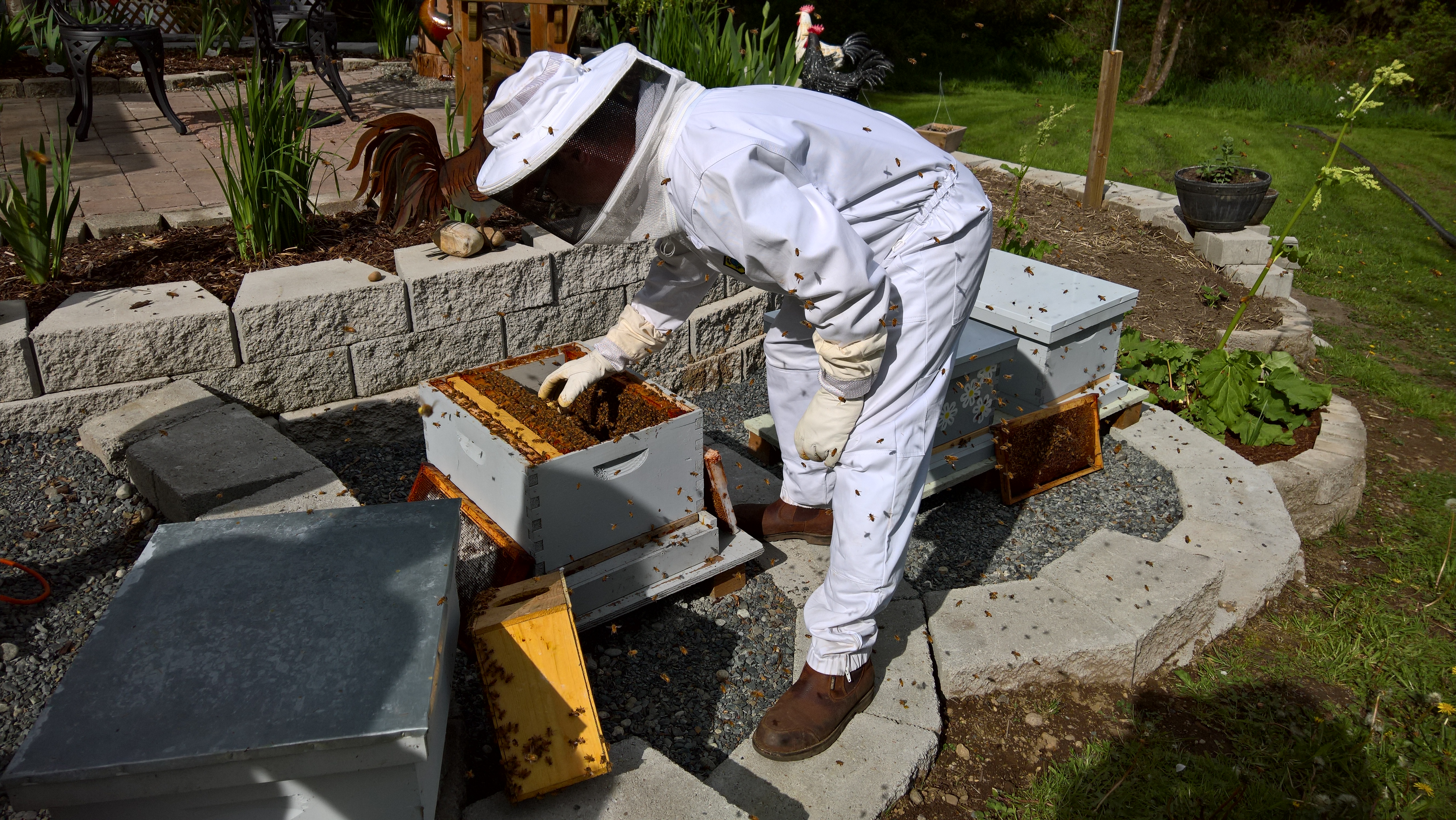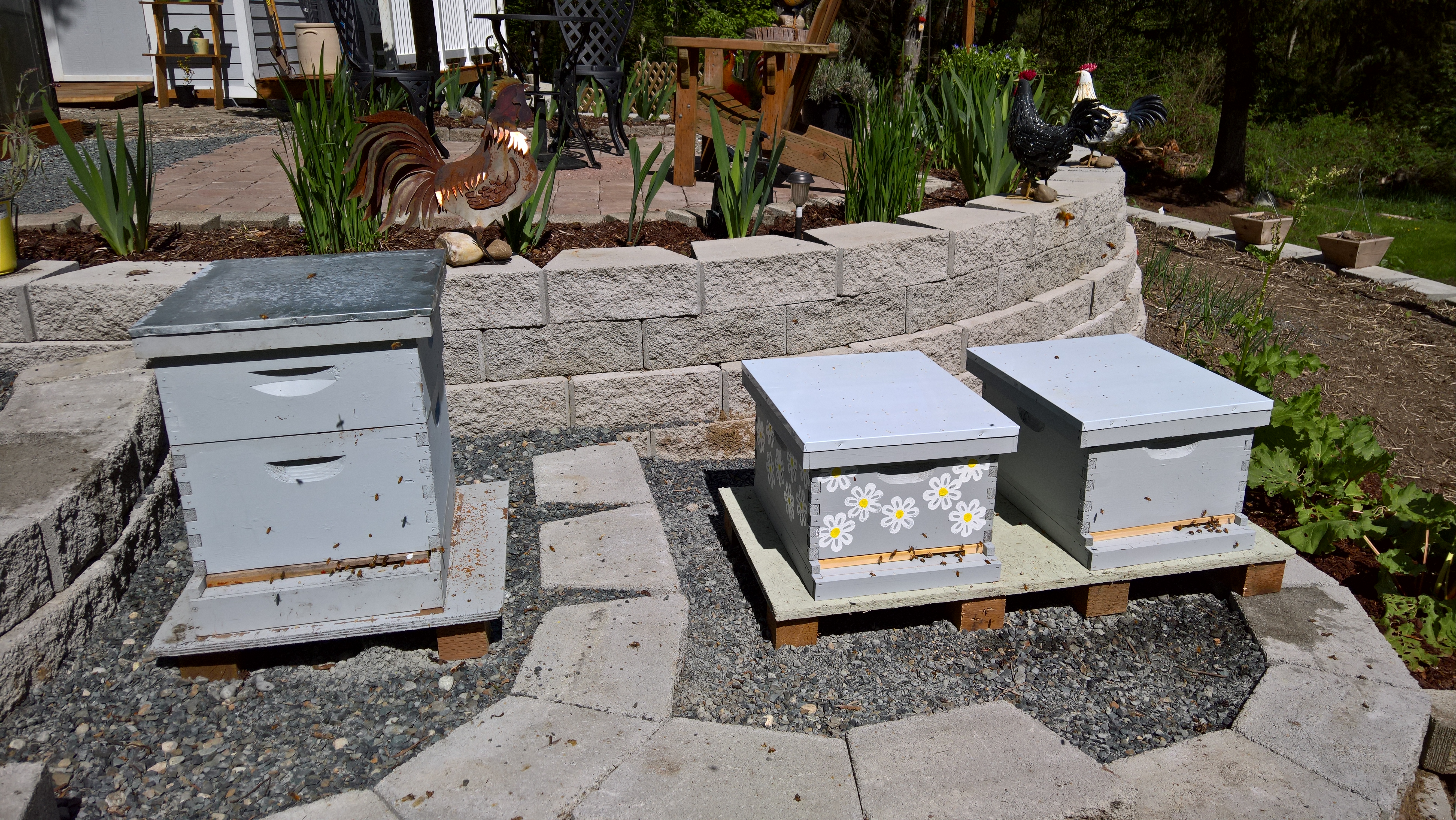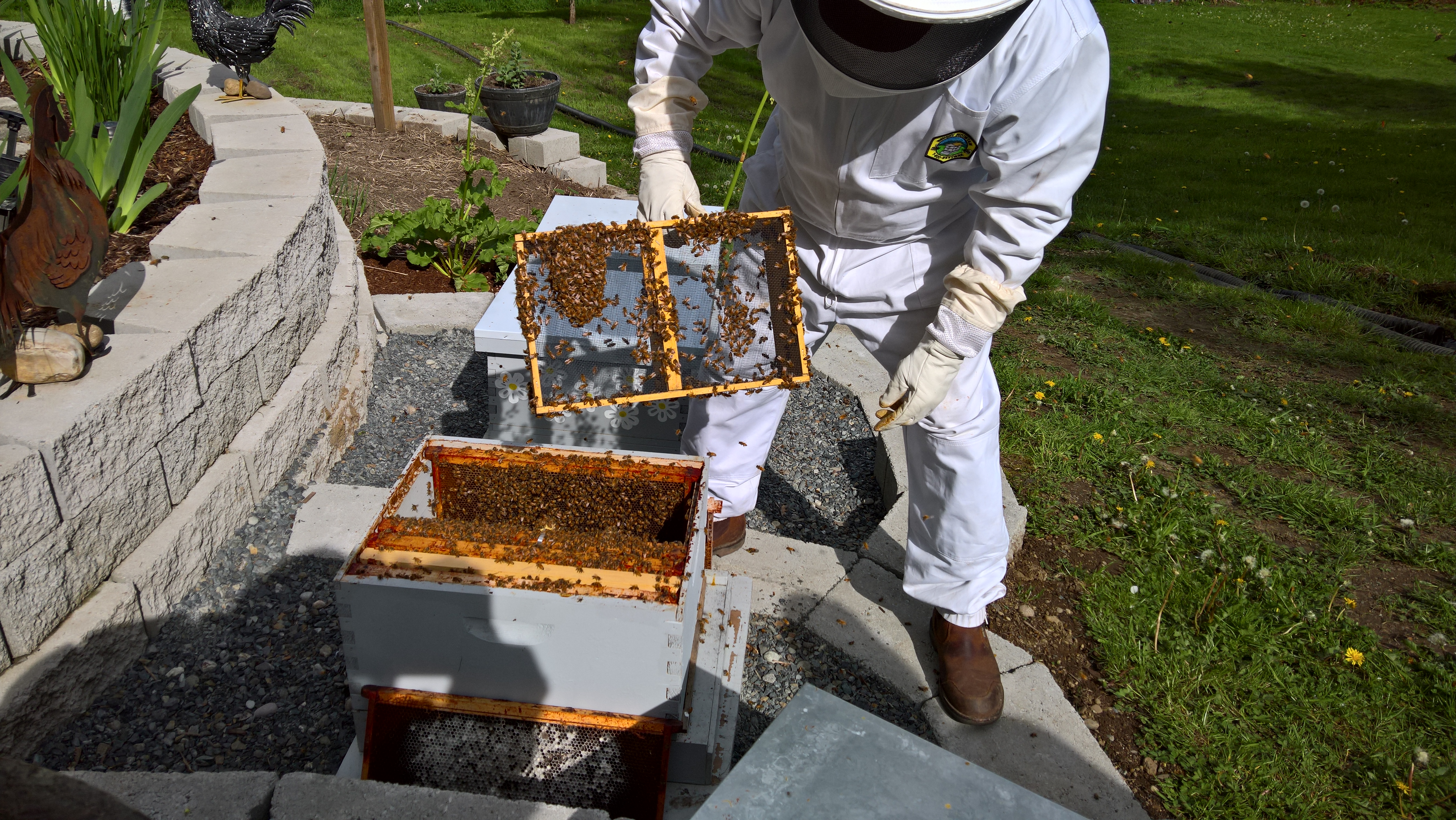 We put the removed frames back in the now vacant spot, refilled the feeders and then closed up the hive. We’ll now regularly check the hive and keep the feeders filled while the bees are building out their new home and while the available flowers are not yet plentiful.
